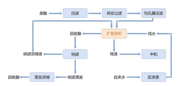 該項目以擴散滲析技術(shù)為核心,將微濾、擴散滲析和納濾等過程耦合。采用微濾工藝作為預(yù)處理,采用山東天維膜技術(shù)有限公司自主研發(fā)的高性能擴散滲析膜實現(xiàn)硫酸回收并除去亞鐵離子,采用納濾工藝實現(xiàn)亞鐵離子的拋光處理,最終實現(xiàn)鈦白粉副產(chǎn)廢硫酸的資源化回收利用。